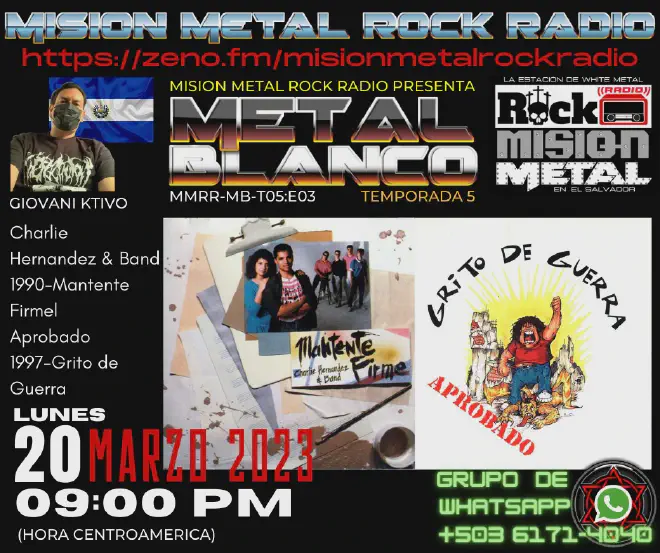 Episodio 3, 5ta Temporada en Metal Blanco, tendremos dos bandas noventeras de Rock en español, APROBADO Y Charlie Hernandez & Band, sonaremos parte de sus primero trabajos respectivamente! Recuerda lunes 20 de Marzo, a las 09:00 pm (Hora Centroamérica) conduce Giovani Cativo por Misión Metal Rock RADIO !